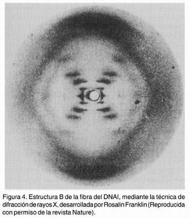 El trabajo original de Watson y Crick se acompañó de dos artículos, uno de Wilkins y colaboradores 7 y el otro de Franklin y su estudiante Gosling. 8 Este último contiene la célebre fotografía de la difracción de Rayos X del DNA en su forma hidratada que claramente revelaba el patrón de una estructura helicoidal (Figura 4). Esta fotografía fue la que Wilkins mostró a Watson y Crick, sin que Rosalin Franklin se enterara. Watson 9 ha reconocido en la "Doble hélice", libro que ha sido uno de los pocos grandes éxitos de divulgación científica, que si Pauling hubiera tenido acceso a los datos generados por Rosalin Franklin les hubiera ganado la carrera por encontrar el modelo verdadero del DNA.
