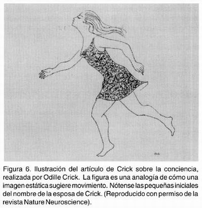 Para conmemorar el medio siglo de la doble hélice escribe un artículo, 20 del que es el primer autor, en la revista Nature Neuroscience, y en el cual para seguir siendo fiel a su costumbre formula nuevas hipótesis, y la manera de comprobarlas, sobre el entramado armónico de la conciencia. Constituye una gratísima sorpresa que la ilustración de este artículo (Figura 6) se deba también a las habilidades artísticas de Odille Crick, la esposa de Crick. La figura ilustra bellamente cómo una imagen estática sugiere movimiento y al pie de la misma, la artista ha colocado muy modestamente las iniciales de su nombre, aunque ahora sí, alcanza un explícito reconocimiento en la sección de agradecimientos del artículo.