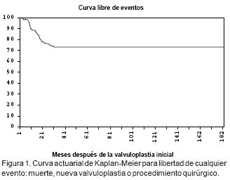 La evaluación inicial de los 70 enfermos fue: fracasos 12 enfermos (17%), 10 de ellos debido a insuficiencia valvular aórtica grado III o IV y dos por gradiente residual superior a 50 mmHg; éxito en 58 enfermos (83%). El seguimiento de los enfermos varió de 6 a 168 meses, media 51 ± 48 meses. La evaluación al final del seguimiento fue: fracasos 21 enfermos (30%) y éxito 49 pacientes (70%). Análisis de los fracasos: un enfermo murió (1.4%), 37 meses después de VAP, tenía daño miocárdico grave con fracción de expulsión de 29%, gradiente de 33 mmHg y murió en choque cardiogénico. El análisis de este caso reveló que al momento del VAP ya tenía daño miocárdico moderado y gradiente de 58 mmHg. Diez enfermos con evaluación inicial calficada de éxito, desarrollaron reestenosis valvular aórtica y fueron sometidos a una nueva intervención, en siete se hizo una segunda VAP exitosa 18.2 meses después de la primera y en tres enfermos se llevó a cabo una valvulotomía quirúrgica exitosa 8,11 y 12 meses después de la VAP inicial. En estos tres enfermos no se consideró una segunda VAP por anatomía valvular desfavorable. Ocho de los 10 enfermos con insuficiencia aórtica grave después de VAP (12.5%) requirieron el implante de una prótesis aórtica en promedio 18.3 meses después de la VAP inicial, todos ellos se encuentran en clase funcional I de la New York Heart Assocciation. La curva actuarial de libertad de evento a 182 meses fue de 73% (Figura 1), mientras que la curvas actuariales libres de nueva VAP o valvulotomía quirúrgica a 182 meses fueron de 87% y 82% respectivamente (Figura 2). El análisis de los 49 enfermos (70%) con éxito al final del seguimiento, mostró un gradiente final no significativo de 29 ± 20 mmHg con insuficiencia aórtica ligera o sin ella y sin necesidad de una segunda VAP o intervención quirúrgica. Se observó una diferencia estadísticamente significativa cuando se comparó el número de fracasos al principio y al final del seguimiento 12 (17%) versus 21 (30%), p < 0.01. En contraste al comparar el número de enfermos con éxito al principio y al final del seguimiento, no se encontró diferencia estadísticamente significativa.