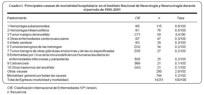 Mortalidad hospitalaria en el Instituto Nacional de Neurología y Neurocirugía "Manuel Velasco Suárez" (19952001)