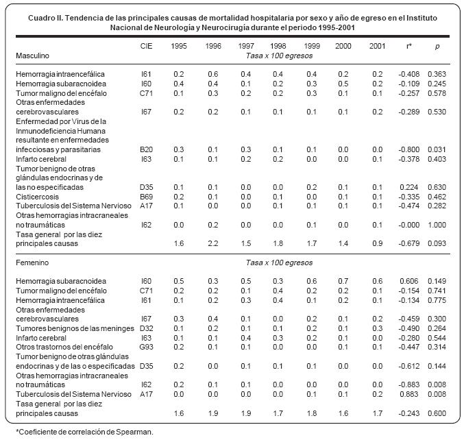 Objetivo: analizar la mortalidad hospitalaria y su tendencia durante el periodo de 19952001 en el Instituto Nacional de Neurología y Neurocirugía "Manuel Velasco Suárez" (INNNMVS).