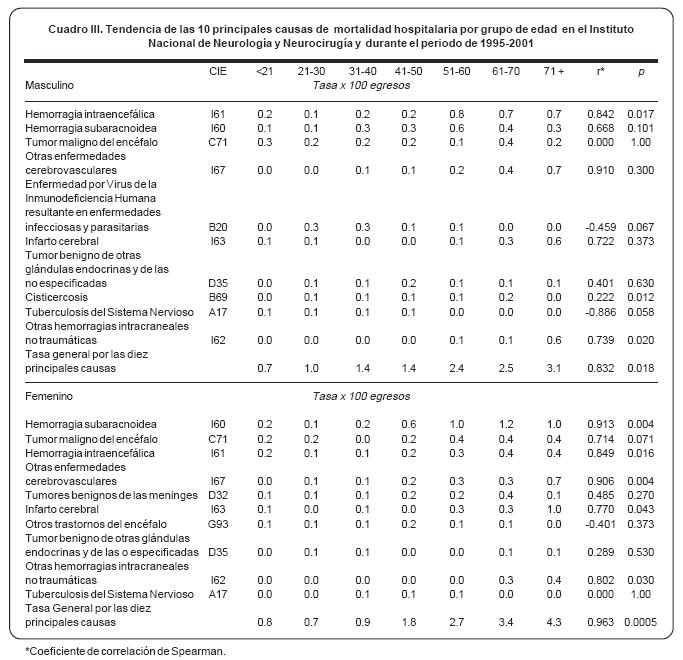 Cuando se analizaron los padecimientos por grupo de edad y sexo se encontró que en el sexo masculino existe una tendencia hacia el incremento conforme avanza la edad para las hemorragias intraencefálicas, cisticercosis y otras hemorragias intracraneales no traumáticas y una tendencia al decremento para la tuberculosis del sistema nervioso y para la enfermedad por virus de la inmunodeficiencia humana resultante en enfermedades infecciosas y parasitarias; sólo en ésta última, la tendencia no fue estadísticamente significativa. Para el sexo femenino encontramos una tendencia estadísticamente significativa al incremento para las hemorragias subaracnoideas e intraencefálica, así como para el rubro de otras hemorragias cerebrovasculares (CIE I67), para los infartos cerebrales y otras hemorragias intracraneales no traumáticas (Cuadro III).