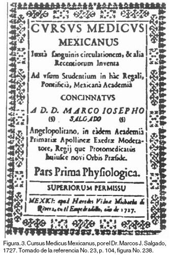 Se sabe que el médico poblano Marcos Joseph Salgado (1671 1740) se interesó mucho en la anatomía y la fisiología del sistema cardiovascular. Su tesis De anatomía cordis y su Disputatio de pulsibus fueron sustentadas en 1690.17 El autor fue nombrado, en 1722, catedrático de Prima de Medicina en la universidad, cargo que desempeñó hasta su muerte. Unos años después de su nombramiento (1727), publicó Salgado un libro que se considera como el primer texto americano de fisiología: Cursus Medicus Mexicanus18 (Figura 3). Las páginas 179 a 217 están dedicadas a los problemas del origen de la sangre, del movimiento del corazón y de la circulación sanguínea. Hallamos los títulos siguientes: De facultatibus humani corporis... Sectio tertia: De chyli in sanguinem conversione. Sectio quarta: De sanguinis circulatione. Sectio quinta: De cordis motu et pulsu. Afirma el autor (p. 184) que el mecanismo de la circulación de la sangre "...ha sido claramente demostrado por William Harvey. En este movimiento circular, la causa principal es el corazón que, con sus latidos, expulsa la sangre empujándola en las arterias. La repetición de latidos cardiacos vigorosos hace que ésta, tras haber dejado el corazón a través de las arterias, vuelva a él por las venas...". El autor describe la circulación pulmonar y la sistémica, así como los movimientos de las aurículas y de los ventrículos. Muestra una tendencia conciliatoria entre la teoría tradicional y la moderna, pero refuta de manera categórica el concepto galénico del origen hepático de la sangre. Se expresa en forma vaga acerca del papel de las válvulas venosas y de la circulación capilar pese a que, en una de sus raras citas, mencione a Malpighi refiriéndose, según Izquierdo, a las Exercitationes de structura viscerum (Francfort, 1678). El verdadero significado fisiológico de la circulación sanguínea pudo entenderse sólo después del descubrimiento del oxígeno y de la captación de este gas por la sangre venosa en los pulmones.19