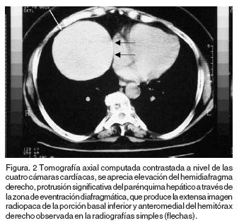 Se describe una imagen radiopaca que hace signo de la silueta con el borde cardiaco derecho en su tercio inferior, se piensa descartar cardiomegalia o una lesión ocupativa del mediastino (Figuras 1a y 1b). En la tomografía axial computada se demostró la eventracion diafragmática del segmento anteromedial del diafragma derecho (Figuras 2 y 3).