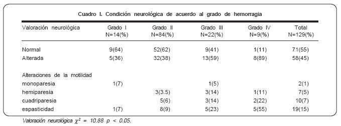 Se estudiaron a 129 niños, ordenados en cuatro grupos conforme al grado de hemorragia; grado I, 14 pacientes, grado II, 84, grado III, 22 y grado IV, 9.
