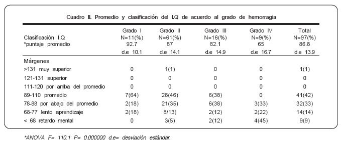 El puntaje global de la escala de Terman Merril para la hemorragia grado I se encuentra en el promedio, sin embargo para los grados II y III, aunque el mayor porcentaje está dentro del promedio, es notorio el aumento de pacientes por abajo del promedio; para la grado IV todos los pacientes está por debajo del promedio, 45% con retardo mental. (ANOVA F= 110.13 p = 0.000000). RM 2.81 IC 95% 1.077.34 p= 0.05 (cuadros II y IV).