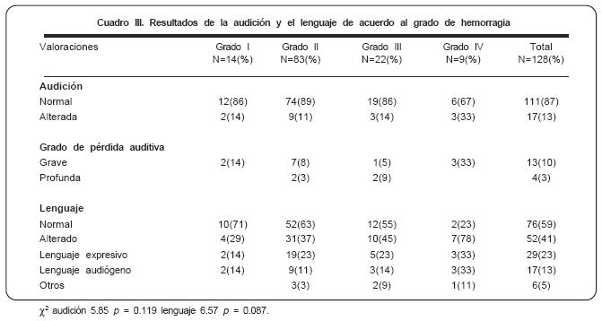 En cuanto a la audición la anormalidad se presentó en todos los grados de hemorragia, la alteración profunda predominó en el grado III y la grave en el grado IV, sin que se encontrara aumento de riesgo cuando se compararon con los grados I/II.