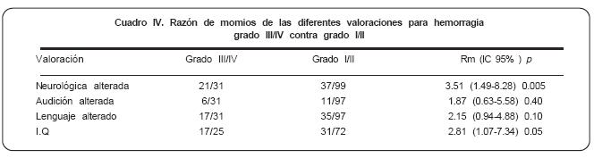 La morbilidad fue semejante en todos los grupos, sólo la hidrocefalia tuvo una frecuencia mayor 73% en la grado III, y la enfermedad crónica pulmonar en la grado IV, con 77%. En la muestra, 45 % presentó alteraciones neurológicas (de leves a graves). En el cuadro I se observa, cómo a mayor grado de hemorragia, mayor número de alteraciones. El mayor porcentaje de alteraciones graves se encontró en la grado IV con 89%, (p < 0.05) predominando la cuadriparesia y la espasticidad, razón de momios (RM) para hemorragia III/IV 3.51 IC 95% 1.498.28 p = 0.005 (cuadro IV).