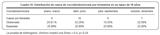 Objetivos: describir las características clinicopatológicas de un grupo de pacientes con coccidioidomicosis (CM) quienes fallecieron en un hospital de referencia del Noreste de México de 19832000; conocer si la frecuencia anual y mensual de fallecimientos se presentó de manera uniforme. Material y métodos: en el Hospital de Especialidades 25 del IMSS se seleccionó de un total de 4598 autopsias 31 casos con CM. Se analizó el expediente clínico y el protocolo de autopsia. Para la determinación de la distribución del número de fallecimientos por trimestre se utilizó una tabla de contingencia y la prueba de KolmogorovSmirnov.