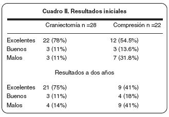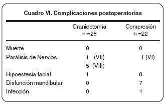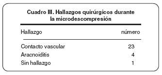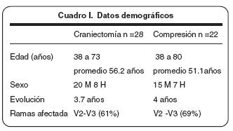 En el cuadro II se puede observar que los mejores resultados se obtuvieron con la descompresión microvascular, en comparación con la compresión. La evaluación de los resultados posquirúrgicos fueron realizados en tres categorías: