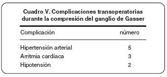 Una complicación molesta para los pacientes en los que se realiza la compresión del ganglio de Gasser es la hipoestesia facial que con frecuencia se presenta en los mismos, hasta 30% en nuestros casos, la literatura reporta 40%, otra complicación también molesta es el mal funcionamiento temporomandibular, que aunque es transitoria se presta en un porcentaje variable en nuestros pacientes. Afortunadamente estas complicaciones no son graves y en la mayoría de las ocasiones no son permanentes.