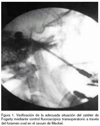 Anestesia general ligera, intubación orotraqueal, decúbito dorsal, punción percútanea, con aguja del número 14 de acuerdo a la técnica de Hartel descrita por Nugeet,9 canulación del agujero oval, corroboración de colocación adecuada mediante intensificador de imágenes, en proyección AP y lateral, introducción de sonda de Fogarty número tres, introducida de 15 a 20 mm después de la punta de la aguja, insuflación del balón a 0.7cm, hasta obtener una imagen en forma de pera durante seis minutos, corroborando la adecuada colocación con el intensificador de imágenes (Figura 1).