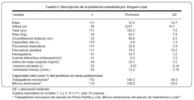 En el cuadro II se muestra el patrón ventilatorio de los sujetos estudiados por Vergara Lope y otros reportados en mexicanos y en sujetos a la altura. Puede verse que la frecuencia respiratoria es considerablemente superior (22 por minuto) a la encontrada posteriormente en mexicanos, e inclusive en habitantes del Tibet y nativos aymarás en alturas superiores (4000 metros), con frecuencias de alrededor de 16 por minuto. La FR de 22 por minuto es similar a la encontrada en la ciudad de México en enfermos respiratorios con fibrosis pulmonar y con Enfermedad Pulmonar Obstructiva Crónica.16,17