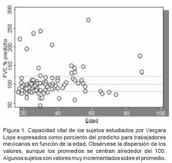 En el cuadro I se presentan los datos reportados por Vergara Lope en los tres cuadros que conjuntan los resultados de sus dos primeros libros. El grupo estudiado fue prácticamente de hombres. Puede observarse que la capacidad vital está un poco por encima de la esperada para las poblaciones actuales mexicanas con la misma talla. En la figura 1 se muestra la dispersión de los valores como por ciento del predicho para una población de trabajadores mexicanos. El promedio está 4% por encima de los valores de referencia, pero se cuenta con una gran dispersión y con sujetos muy por fuera de lo esperado, tanto hacia arriba como hacia abajo.