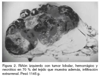 En el examen macroscópico el riñon pesó 1145 g, de decapsulación imposible y que midió 18 x 13 x 15 cm. El órgano estaba substituido en sus 4/5 partes por un tumor intensamente hemorrágico y necrótico, lobular con algunos septos incompletos, blando y bien limitado. Comprimía y rechazaba al sistema pielo calicial de superficies lisas, mientras los vasos del hilio se encontraron permeables.