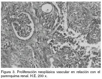De los tumores benignos soló se conocen poco menos de 200 casos publicados9 mientras los sarcomas constituyen cerca de 2% de todos los tumores malignos primarios renales.10 A diferencia de otras localizaciones, no se ha encontrado relación con carcinógenos, factores hereditarios u otros8,11 La clasificación de los angiosarcomas se basa en criterios morfológicos que van desde el hallazgo de vasos rudimentarios y abortivos a lesiones compactas muy indiferenciadas.