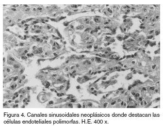 Microscópicamente el tumor es francamente anglomatoso y sin estructuras epiteliales, hemorrágico y necrótico. Existen proliferaciones vasculares de células endoteliales atípicas, mitosis anormales frecuentes y paredes de tipo sinusoidal demarcadas por reticulina; otras zonas densas e hipercelulares tienen el mismo aspecto vascular.