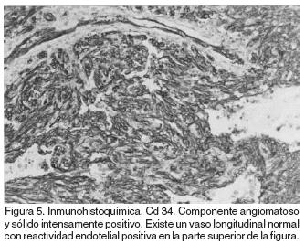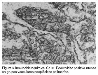 La inmunotinción Suash Sharma, NM; Department of Pathology, UT Southwestern Medical Center, Dallas, TX reveló que el tumor era difusamente positivo para CD 31 y CD 34. La actina muscular liso fue reactiva en células de los vasos sanguíneos del tumor, pero negativa en las células neoplásicas igualmente negativas fueron las citoqueratinas (AEI/AE3), S100 y HMB 45 (Figuras 5 y 6).