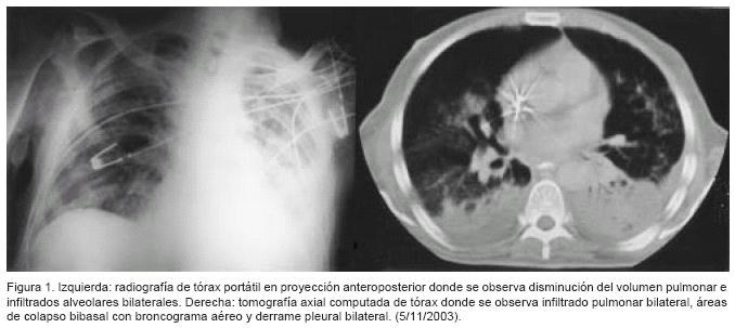 Hombre de 64 años que ingreso a la Unidad de Cuidados Intensivos por choque séptico secundario a neumonía nosocomial por Stenotrophomona maltophilla. En la radiografía de tórax se observó disminución del volumen pulmonar e infiltrados alveolares bilaterales; la tomografía axial computada (TAC) de tórax mostró infiltrado pulmonar bilateral, áreas de colapso bibasal con broncograma aéreo y derrame pleural (Figura 1).