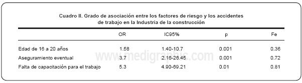 En el análisis multivariado se identificaron como factores asociados para produciraccidentes de trabajo en la industria de la construcción al grupo de edad de 16 a 20 años, tipo de aseguramiento eventual, así como ausencia de capacitación para el trabajo; asimismo fue calculado la FeE de cada uno de estos factores (cuadro II).