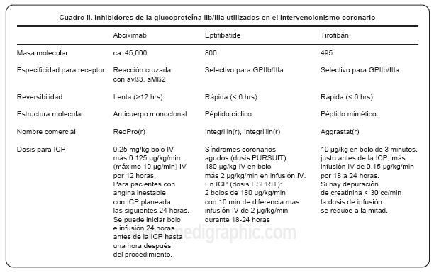 Inhibidores de la glucoproteína IIb/IIIa: a pesar del pretratamiento con aspirina, los eventos isquémicos precoces aún se siguen presentando, con incidencia que va de 3% a 12,8%. Tras la angioplastía otros potentes agonistas plaquetarios siguen presentando gran actividad, y son capaces de inducir la formación de adenosín difosfato y serotonina y con ello fomentar la expresión de receptores de GP IIb/IIIa en la superficie plaqueta ria.4245 Una vez que se han activado dichos receptores, éstos funcionan como puentes entre las plaquetas el fibrinógeno y otras moléculas de adhesión plaquetaria y constituyen de este modo la vía común final de la formación del trombo plaquetario. De este modo es como los receptores GP IIb/IIIa se convirtieron en una diana más para el tratamiento de los síndromes coronarios agudos.4145 En el cuadro II se enuncian los inhibidores GP llb/llla de uso más frecuente, las dosis habituales y sus principales características.