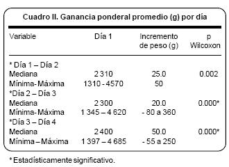 Aproximadamente 90% de los neonatos obtuvieron ganancia ponderal con la administración de la fórmula. En cuatro de los cinco neonatos que no presentaron ganancia ponderal, el problema fue la patología de base, y en un caso se presentó vómito. Entre los 50 pacientes con información del peso durante cuatro días, la mediana de peso al ingreso el primer día fue de 2 300 g (mínimo 1 305 a máximo 4 620 g). La mediana de peso ganado por día por los pacientes fue de 27.5 g (Cuadro I). El aumento ponderal promedio obtenido en cada día se muestra en el cuadro II. Al segundo día la mediana de ganancia de peso fue de 20 g, la cual fue significativa (p= 0.002), con relación al primer día. Al compararse con la mediana de peso promedio del primer día de alimentación, el peso ganado al tercer día fue de 20 g como mediana, altamente significativo (p= 0.000) y al cuarto día la mediana del incremento ponderal fue de 50 g, altamente significativo también (p= 0.000) con relación al primer día.