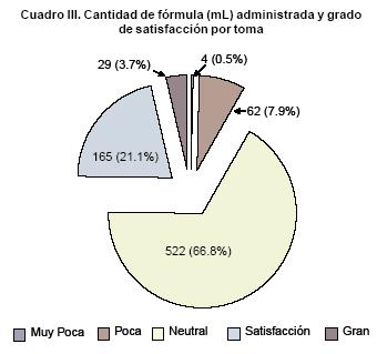 Para medir, en lo posible el grado de satisfacción de los neonatos a la fórmula en evaluación, se utilizó una escala visual de cinco puntos descrita arriba resuelta por la persona que alimentó a los pacientes en cada ocasión, considerando en general a la misma persona para cada paciente durante la encuesta. Existieron 782 evaluaciones (aproximadamente 15 por paciente). Los resultados mostraron que 66.8% de las veces los pacientes aceptaron la fórmula sin problema (grado de satisfacción = 0); 21.1% de las veces los pacientes aceptaron la fórmula con satisfacción (grado de satisfacción = +1); y para 3.7% de los casos los pacientes aceptaron la fórmula con gran satisfacción (grado de satisfacción = +2); (Cuadro III).
