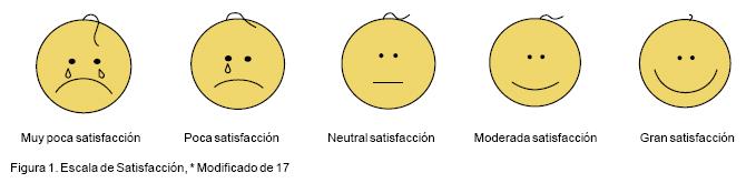 Para evaluar la aceptabilidad y paleatibilidad de la fórmula por parte de los neonatos se usó una escala análoga basada en la "Escala de Dolor" desarrollada por los doctores Ada Rogers y Raymon W Houde en el Memorial SloanKettering Cancer Center de la ciudad de Nueva York17, que usa figuras de expresión facial para medir la respuesta del paciente. La escala consiste en cinco "caritas" que muestran bienestar (en el extremo derecho) y varían hasta el llanto (extremo izquierdo), pasando por una imagen central que es neutral (Figura 1). Los resultados de la anterior evaluación por los alimentadores fueron divididos como caritas de gran satisfacción, de satisfacción y neutrales (sin problema). Para el análisis estadístico se dio la calificación de 2,1, 0, +1 y +2; según la satisfacción del neonato.