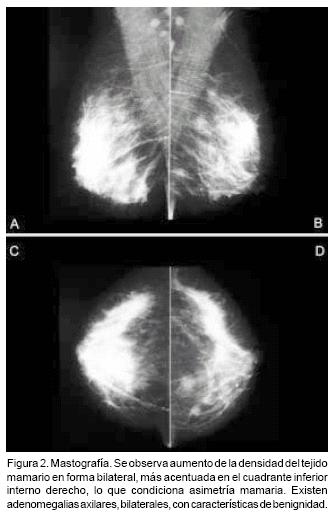 Mastografía: aumento de la densidad del tejido mamario en forma bilateral, con mayor aumento de la densidad del cuadrante inferior interno derecho, lo que condicionaba asimetría mamaria, adenomegalias axilares, bilaterales, con características de benignidad, (Figura 2).