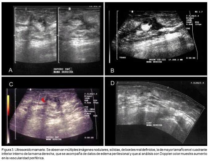 Ultrasonido mamario: múltiples imágenes nodulares, sólidas, de bordes mal definidos, la de mayor tamaño en el cuadrante inferior interno de la mama derecha, que se acompaña con datos de edema perilesional y que al análisis con Doppler color mostró aumento en la vascularidad periférica, (Figura 3).