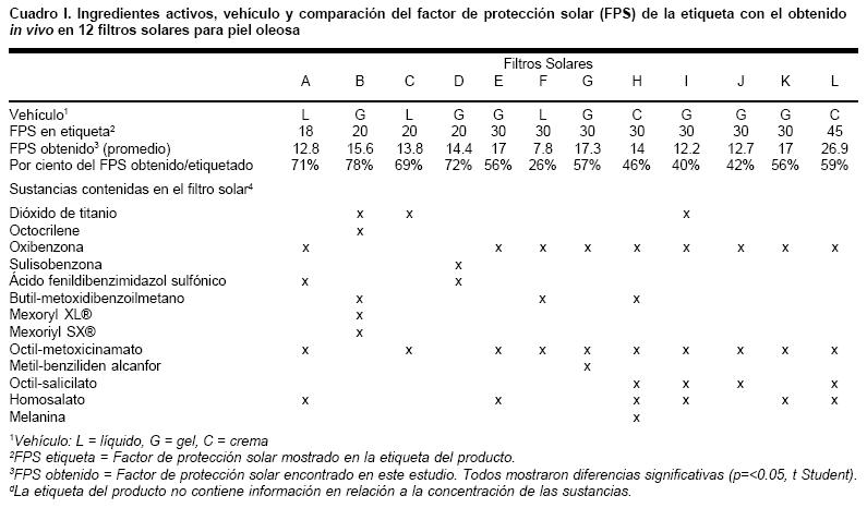 Un filtro fue etiquetado para su venta con un FPS de 45, 7 con 30, 3 con 20, y sólo uno con 18. El FPS obtenido experimentalmente, los ingredientes, así como el vehículo de los 12 filtros solares se muestra en el cuadro I. Sin excepción, todos los productos fueron etiquetados con factores de protección mayores a los encontrados en este estudio siendo estadísticamente significativo (p =0.05).