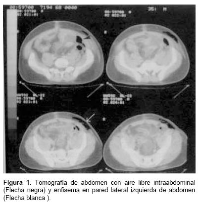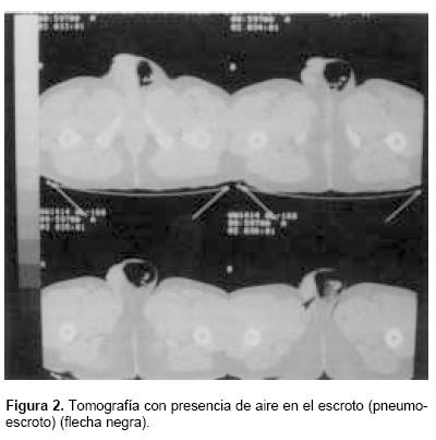 Paciente masculino de 35 años, portador de enfermedad diverticular complicada manejado con colostomía en asa en Chiapas. Enviado para cierre de colostomía por lo cual se sometió a hemicolectomía izquierda con colocoloanastomosis termino terminal. Cursó con evolución favorable de manera inicial. El cuarto día postoperatorio presentó fiebre de 38°C, distensión abdominal, dolor cólico generalizado y aumento de volumen escrotal izquierdo indoloro. A la exploración física se encontró con abdomen distendido, doloroso, datos de irritación peritoneal dudosos. Con crepitación desde región inguinal izquierda hasta el escroto. Los exámenes de laboratorio reportaron 15 mil leucocitos. La tomografía abdominopélvica con escaso aire libre en abdomen y enfisema en pared que llega hasta el escroto (Figuras 1 y 2).