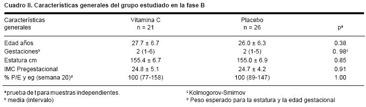 De las 52 mujeres invitadas 47 completaron el estudio sin que se encontraran diferencias en la deserción según el grupo de tratamiento, la edad o la concentración basal de vitamina C en plasma o en leucocitos. En el cuadro II se presentan las características generales de las mujeres estudiadas. Como se puede observar en general eran mujeres multigestas con un promedio de edad de 27 ± 6.7 años y su IMC pregestacional informado mostró una tendencia al sobrepeso (IMC 24.5 ± 4.5). Durante la gestación su porcentaje de adecuación de peso para la estatura y edad gestacional (PIT y EG) se ubicó entre los 107 y 111 % de acuerdo a las tablas de Arroyo.15