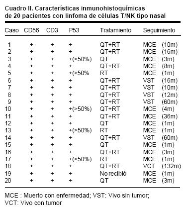 Se analizan 20 casos de linfomas extraganglionares de células T/NK de tipo nasal, estudiados en el Instituto Nacional de Cancerología, México, D. F., para su expresión inmunohistoquímica de las células neoplásicas, expresión nuclear de la proteína supresora de tumor p53, así como de enzimas que participan en invasión, destrucción tisular y metástasis: metaloproteasas.