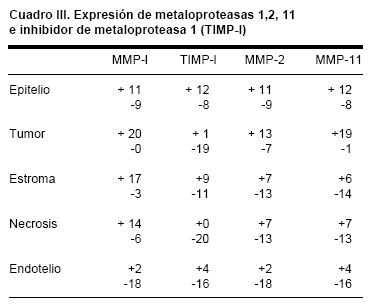 Estudio estadístico: Se analizó la prueba exacta de Fisher para correlacionar la expresión entre las metaloproteasas y su diferencial entre las células epiteliales, tumorales, estromales, necrosis y células endoteliales.