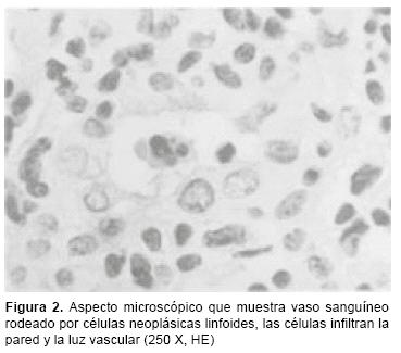 En todos los casos se demostró infiltrado de células linfoides atípicas de forma difusa, con angioinvasión y acompañados por zonas de necrosis confluente de tipo coagulativo (Figuras 2 y 3). El espectro histológico varió desde células grandes a células de tamaño intermedio, predominando el patrón mixto (17 casos). Las células linfoides atípicas frecuentemente mostraron irregularidad nuclear, patrón de cromatina en grumos gruesos, con ocasionales nucléolos principalmente en las células grandes y mitosis atípicas. Acompañando a estas células linfoides atípicas, se observaron cantidades variables de células plasmáticas, histiocitos, neutrófilos y eosinófilos (estos últimos en relación con zonas de ulceración).