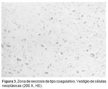 Debido a que las células neoplásicas parecen tener predilección por invadir y destruir la pared de los vasos sanguíneos, frecuentemente se encuentran extensas zonas de necrosis, por ello, se ha enfatizado en la necesidad de efectuar por lo menos seis biopsias en diferentes zonas de la lesión, y así evitar el retraso en el diagnóstico de la enfermedad.2 Estas zonas de necrosis igualmente pueden ser secundarias a la liberación de gránulos citotóxicos por las células T y NK como lo demostró Elenitoba y cols, en el que prácticamente todos su casos mostraron positividad a perforinas, granzimas y TIA1.18