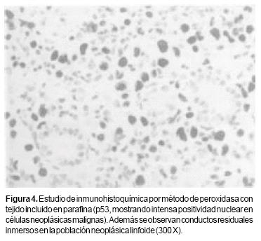 El gene p53 es el más frecuentemente mutado en cáncer humano, y es el prototipo regulador del crecimiento y división celular.39 Sin embargo, las mutaciones del gene p53 son relativamente raras en los linfomas noHodgkin.31 Extrapolando el hallazgo de Quintanilla y cols, en su análisis de la presencia de mutaciones del gene p53 en cinco pacientes de 25 y que en cuatro de éstos pacientes tuvieron un curso evolutivo fatal, realizamos inmunohistoquímica para p53 y se observó que cinco pacientes (caso 3,5,10,13 y 17) tuvieron sobreexpresión de esta proteína nuclear y de la misma manera los pacientes tuvieron un curso clínico agresivo, falleciendo los pacientes en menos de cuatro meses, independientemente de la modalidad de tratamiento instituido. Cabe destacar que tres de estos pacientes recibieron únicamente radioterapia, y la muerte en ellos ocurrió dentro del primer mes de recibir tratamiento, a pesar que dos de ellos tenían etapa clínica temprana. Sun, Wicha y Leopold40 mencionan que pacientes que reciben radioterapia pueden manifestar mayor expresión y daño de p53 con el consiguiente aumento en la agresividad tumoral, por lo que debe tomarse en cuenta en estudios futuros.