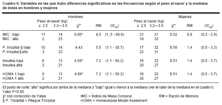 Se realizó el análisis de cada variable en tablas de 2 x 2, de acuerdo a su mediana correspondiente en el grupo total. En el cuadro II aparecen los resultados de las variables que tuvieron diferencias significativas. En los hombres, que al nacer tuvieron 32003500 g de peso, el IMC, el pliegue tricipital, la insulina y el puntaje HOMA dieron diferencias significativas (p<0.05) para la
