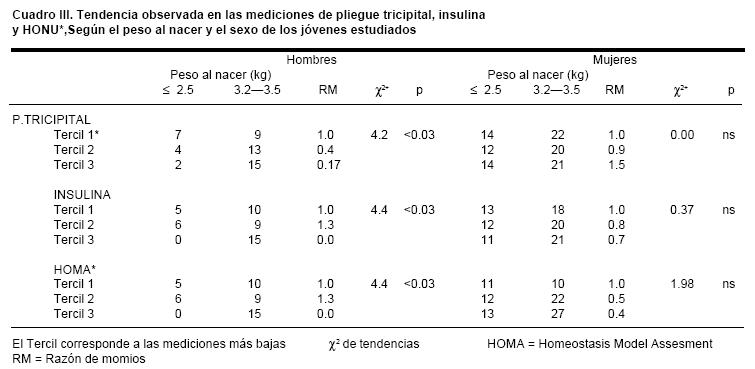 Se cotejaron las mediciones del pliegue tricipital, la insulina y el HOMA, según la distribución tercilar de estas variables de acuerdo al peso con que nacieron. En el cuadro III se puede observar que en los hombres, la