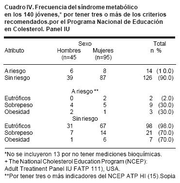 En cuanto al síndrome metabólico,el cuadro IV muestra la prevalencia entre hombres y mujeres que tuvieron tres o más factores de riesgo, según los criterios del ATP III(15) para calificar este síndrome; 14 (10%) del total de los jóvenes reunieron criterios de síndrome metabólico. También se puede observar la distribución de la frecuencia de ellos, de acuerdo a los puntos de corte para el IMC. Hubieron más jóvenes con sobrepeso y obesidad que tuvieron tres o más de los criterios del ATP III; en la mayoría de los eutróficos no se identificó el síndrome. Cabe mencionar que uno de los 11 varones y una de las 36 mujeres, con peso al nacer <2500 g, tuvieron tres criterios del ATP III, además de sobrepeso, y tres mujeres con peso al nacer < 2500 g más tres criterios y un IMC por arriba de 30 kg/m2 (obesidad).