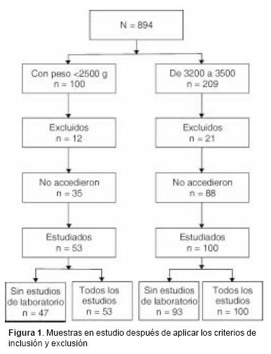 Los sujetos de estudio provienen de una cohorte de 894 estudiantes que ingresaron a la Facultad de Medicina de la Universidad Nacional Autónoma de México, en el ciclo escolar 20022003. Con objeto de identificar quiénes de ellos sabían su peso al nacer, se hizo una encuesta de la que se obtuvo información acerca de su edad, sexo, peso al nacer, lugar que ocupaban entre sus hermanos y si habían nacido de parto múltiple. De esta manera se identificaron 100 jóvenes, aparentemente sanos, nacidos de parto único, con peso <2500 g; de ellos, se excluyeron a 12 por asistir a clase en el horario vespertino (debido a la dificultad para obtener en ellos una muestra de sangre en ayuno). Se invitaron a participar a 88 y de ellos accedieron 53. Éstos formaron parte del grupo de peso < 2500 g.