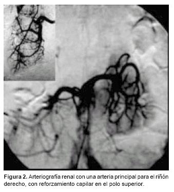 Los exámenes de gabinete mostraron en la urografía excretora desplazamiento de sistemas colectores hacia la línea media, malrotación renal bilateral, e irregularidad del sistema pielocalicial derecho, el cual tenía efecto de compresión extrínseca con ectasia pieloureteral leve. Se decidió realizar una TAC abdominal en la que se observó fusión de ambos riñones en su polo inferior, además de malrotación renal bilateral y nefromegalia derecha a expensas de un tumor del polo superior con invasión a la grasa perirrenal y que deformaba el sistema pielocalicial. No había datos de adenopatías regionales ni de invasión vascular (Figura 1). Con un objetivo quirúrgico se realizó una arteriografía renal en la que se evidenció una arteria principal para cada riñón, dependientes de la aorta, así como una arteria renal accesoria también dependiente de la aorta que se bifurcaba hacia el istmo. El polo inferior del riñón derecho mostraba distorsión del ramo apical de la arteria renal principal y aumento de la trama capilar (Figura 2).