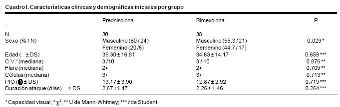 Se estudió un total de 68 pacientes: 30 en el grupo de prednisolona y 38 en el de rimexolona. El cuadro I resume las características iniciales de los pacientes. Como se observa en el grupo de prednisolona predominaron los varones en comparación con el de rimexolona, en el que la proporción de hombres y mujeres fue similar. El resto de características iniciales fueron similares en uno y otro grupos.