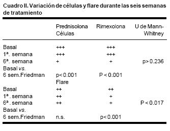 Con respecto a la desaparición del flare, los resultados fueron diferentes para cada grupo (Cuadro II). En el tratado con prednisolona el flare presentó una mediana inicial de ++, la cual se mantuvo igual a lo largo de las seis semanas de tratamiento. En el grupo de rimexolona el flare tuvo una mediana inicial de ++ que disminuyó a una mediana de + a partir de la primera semana de tratamiento, manteniéndose así hasta el final del estudio (Friedman, p< 0.001). Al comparar la eficiencia para el control del flare entre los grupos se encontraron diferencias estadísticamente significativas a favor del grupo de rimexolona en cada una de las visitas de la primera a la sexta semanas (U de MannWhitney, p< 0.017).