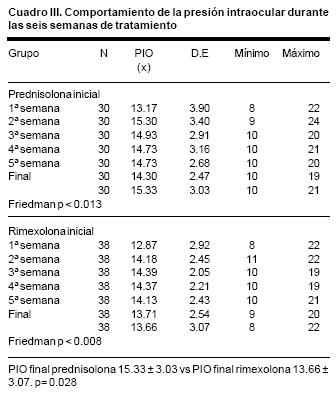 La variación de la presión intraocular fue una de las variables de desenlace más importantes. Ni la prednisolona ni la rimexolona provocaron elevación clínicamente significativa de la PIO (Cuadro III). Sin embargo al analizar la significancia estocástica de estos cambios dentro de cada grupo sí se encontraron diferencias significativas (Friedman, prednisolona p=0.013; rimexolona p= 0.008). Al comparar la PIO final en el grupo de prednisolona y el de rimexolona, se encontró una presión menor en el grupo de rimexolona (15.33 ± 3.03 vs13.66 ± 3.07, p= 0.028)