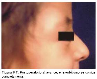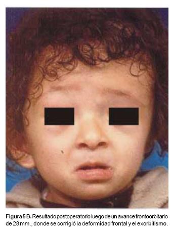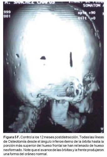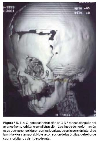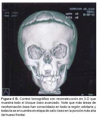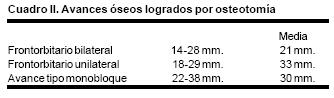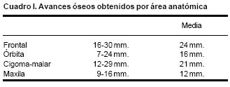 En todos los pacientes se logró el avance planificado de los segmentos óseos, al corregir la deformidad del hueso frontal, el exorbitismo y en la retrusión del tercio medio en los casos con avance en monobloque. Los avances mayores se obtuvieron en el hueso frontal y variaron entre 16 y 30 mm., mientras que los menores fueron los del hueso maxilar que fluctuaron entre 9 y 16 mm. (Cuadro I). Radiológicamente los controles postoperatorios tempranos mostraron inicialmente áreas de hipodensidad ósea, que al final del periodo de consolidación cambiaron a áreas de densidad ósea radiológica normal, lo que significa neoformación de hueso. Las áreas de hueso neoformadas que consolidaron en forma más rápida, son las ubicadas en las líneas de osteotomía de la unión pterigomaxilar, pared lateral de la órbita y unión frontoorbitaria. Las áreas que más tardaron en consolidar incluye la porción lateral y superior del hueso frontal.