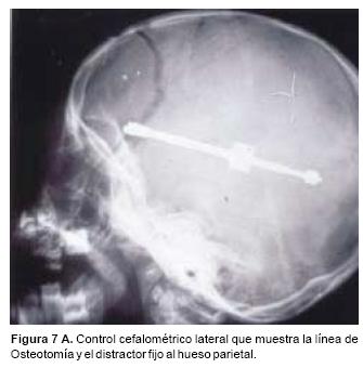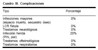 Las complicaciones en esta serie clínica se ven limitadas a la presencia de infecciones de la piel cabelluda en el sitio de salida del distractor en 20% de los pacientes, lo que resolvió con antibióticos y limpieza local. Abscesos intracraneanos, secuestros óseos, graves infecciones, graves infecciones por contaminación por la vía aérea, fístulas de líquido cefalorraquídeo, convulsiones u otras alteraciones neurológicas, no se han observado en este grupo de pacientes (Cuadro III).