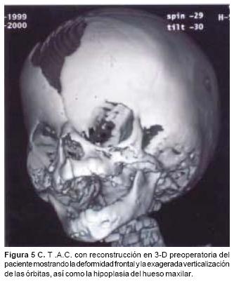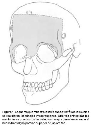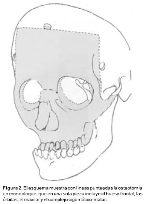 Las osteotomías a utilizar se diseñan previamente en las reconstrucciones tridimensionales obtenidas con la T.A.C., y ésta varía de acuerdo a la deformidad de cada paciente. Las más utilizadas son: osteotomías frontoorbitarias bilaterales (Figura 1), osteotomía tipo monobloque (Figura 2) y osteotomía frontoorbitomalar unilateral (Figura 3). La osteotomía seleccionada se dibuja sobre la estructura esquelética disecada utilizando violeta de genciana. En este momento se selecciona 2 o 3 sitios sobre el hueso frontal para las craneotomías. Y una vez completadas estás, se realiza una disección intracraneana muy limitada que sigue las líneas de las osteotomías en el área frontal y orbitaria, creando una serie de túneles intracraneanos y preservando la mayoría de los puentes vasculares entre las meninges y el hueso frontal. El mismo procedimiento se utiliza para el techo orbitario. A través de los túneles se introducen tiras de gasas y separadores muy finos que permiten la realización de las osteotomías con sierras oscilatorias, sin daño a las estructuras subyacentes. Con un endoscopio rígido de visión directa se verifica la hemostasia y la integridad de las meninges luego de realizar las osteotomías. Así mismo bajo visión endoscópica se realiza una cuidadosa disección del área de la Crista Galli y de las alas menores del esfenoides en su unión con la órbita y el frontal, lo que permite completar las osteotomías a nivel central y lateral y la movilización de toda la estructura ósea a avanzar. En los casos de monobloque, la línea de osteotomía se continúa de la pared lateral orbitaria a la unión pterigomaxilar y sobre el piso y la pared medial de la órbita. En estos casos la disyunción con pinzas de Rowe del área pterigomaxilar, se hace necesario a fin de avanzar en un verdadero monobloque el maxilar unido a las órbitas y al hueso frontal (Figura 2).