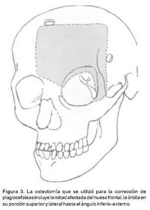 En las plagiocefalias realizamos una osteotomía que avanza sólo la mitad deformada (Figura 3). Ésta es una osteotomía que se adapta a la gravedad de la deformidad en la órbita y en el malar. Cuando el malar está hipoplásico la osteotomía se extiende hasta incluirlo. En todos los casos la osteotomía se extiende entre 15 y 20 mm., pasando la línea media frontal, luego baja, atraviesa el nasión y llega al ángulo superointerno de la órbita, incluyendo el techo y continuándose por el mismo hasta llegar al lado contralateral. En estos casos el avance se realiza a manera de bisagra, debido a que en la porción medial de la frente se efectúa osteotomía en rama verde, mientras que en la porción lateral y de la órbita se efectúa una osteotomía total. Los distractores se apoyan con un vector semioblicuo (a 25° sobre el plano de Francfort), en la unión fronto orbitaria, avanzando más importantemente la porción lateral, mientras que la osteotomía en rama verde funciona como un pivote medial.